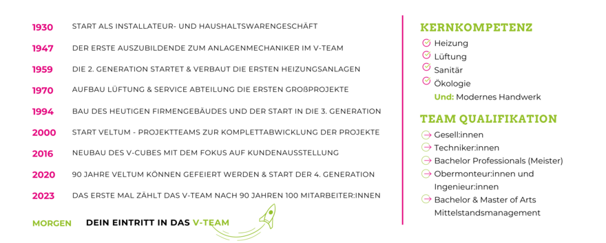 Wir sind das V-Team – genau genommen das Team hinter der Veltum GmbH. Mit über 100 engagierten und faszinierenden Mitarbeiter:innen sind wir leidenschaftlich dem Handwerk verbunden. Unsere Expertise erstreckt sich auf Sanitär, Heizung, Lüftung und Ökologie. Regional sehr stark verwurzelt, setzen wir deutschlandweit nachhaltige Heizkonzepte um.
